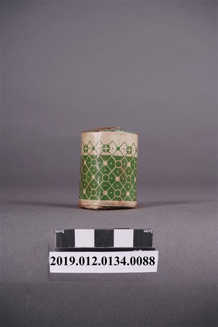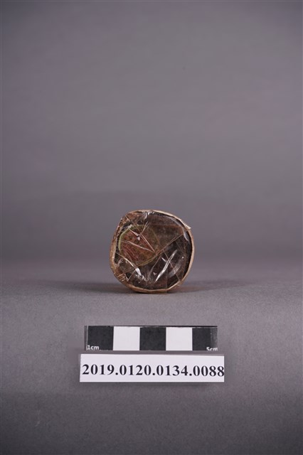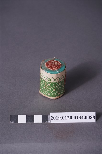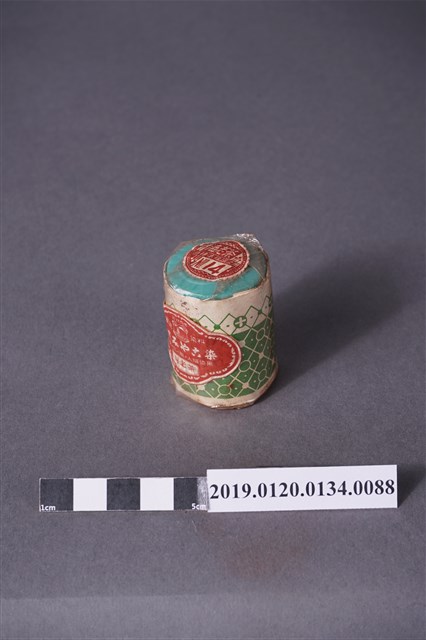 本文物為日治時期的染料,為裝有深紅色的染料罐。染料罐外圍以印有綠色花紋的紙張包住,罐子正面貼有紅色紙張,並印有「直接みや古染」、「木綿、麻、絹、人絹染用」、「海老茶」及「家庭染料」等字的紙,並印有一燈塔樣。瓶蓋處的紙張印有「直接……」及「NO.14」等字。
