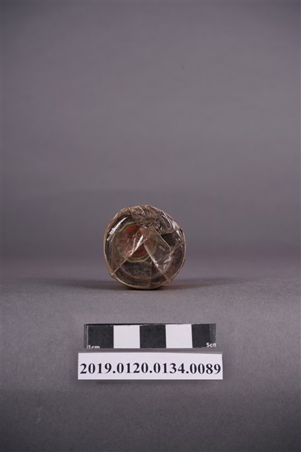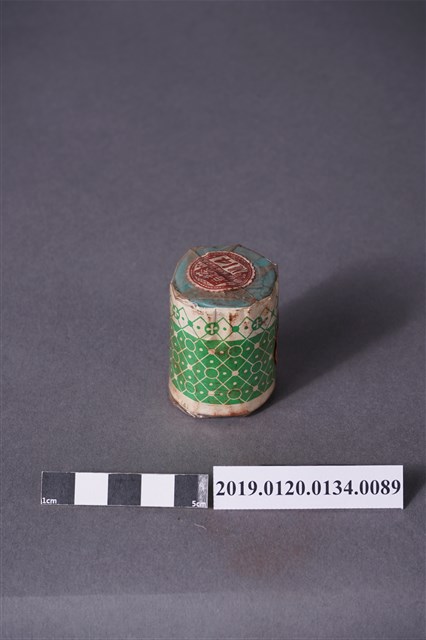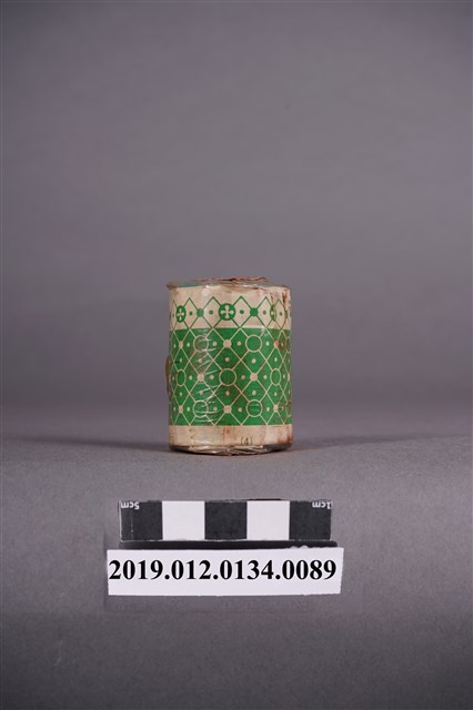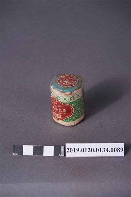 本文物為日治時期的染料,為裝有深紅色的染料罐。染料罐外圍以印有綠色花紋的紙張包住,罐子正面貼有紅色紙張,並印有「直接みや古染」、「木綿、麻、絹、人絹染用」、「海老茶」及「家庭染料」等字的紙,並印有一燈塔樣。瓶蓋處的紙張印有「直接……」及「NO.14」等字。
