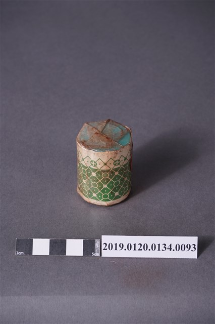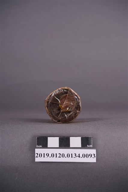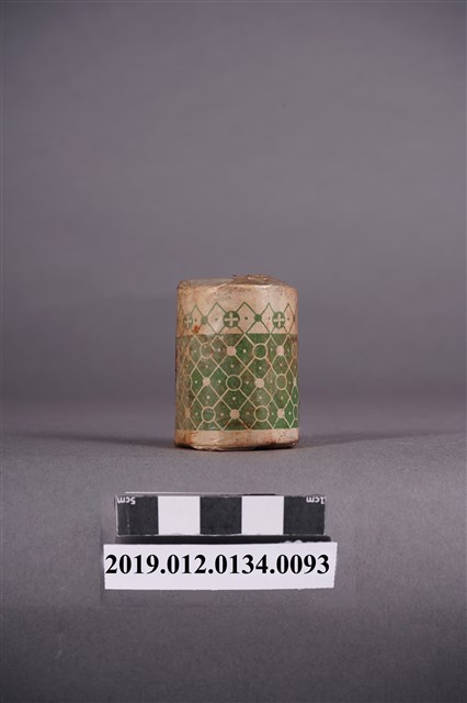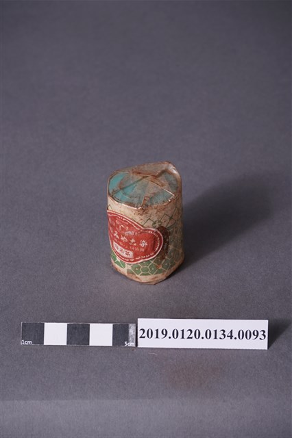 本文物為日治時期的染料,為裝有深紅色的染料罐。染料罐外圍以印有綠色花紋的紙張包住,罐子正面貼有紅色紙張,並印有「直接みや古染」、「木綿、麻、絹、人絹染用」、「海老茶」及「家庭染料」等字的紙,並印有一燈塔樣。瓶蓋處的紙張印有「直接……」及「NO.14」等字。