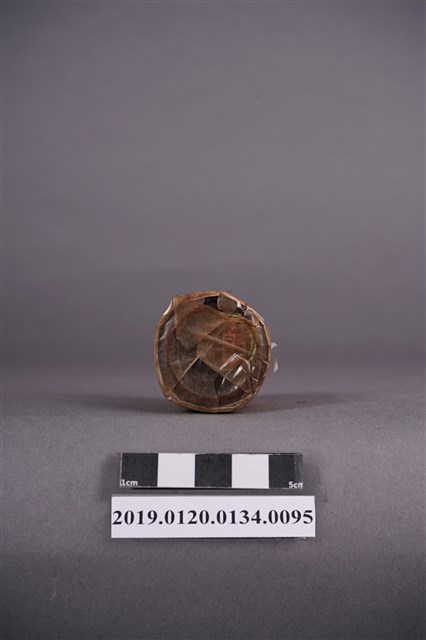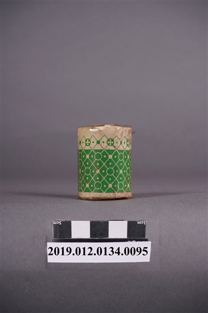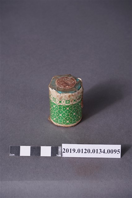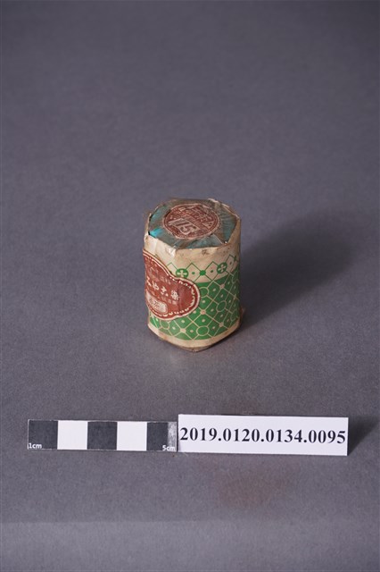 本文物為日治時期的染料,為裝有褐色的染料罐。染料罐外圍以印有綠色花紋的紙張包住,罐子正面貼有紅色紙張,並印有「直接みや古染」、「木綿、麻、絹、人絹染用」、「赤茶」及「家庭染料」等字的紙,並印有一燈塔樣。瓶蓋處的紙張印有「直接……」及「NO.15」等字。