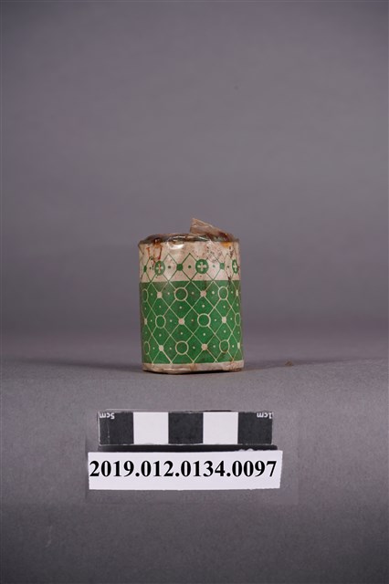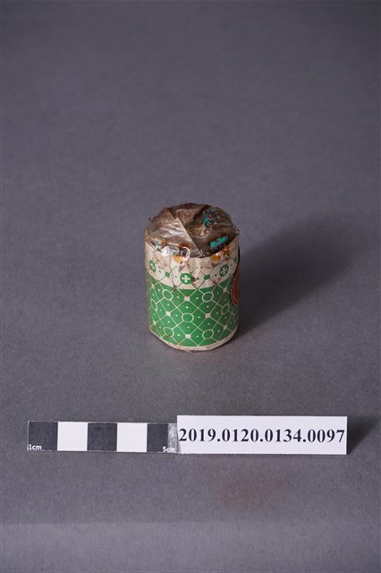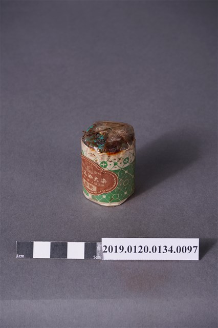 本文物為日治時期的染料,為裝有褐色的染料罐。染料罐外圍以印有綠色花紋的紙張包住,罐子正面貼有紅色紙張,並印有「直接みや古染」、「木綿、麻、絹、人絹染用」、「赤茶」及「家庭染料」等字的紙,並印有一燈塔樣。瓶蓋處的紙張印有「直接……」及「NO.15」等字。