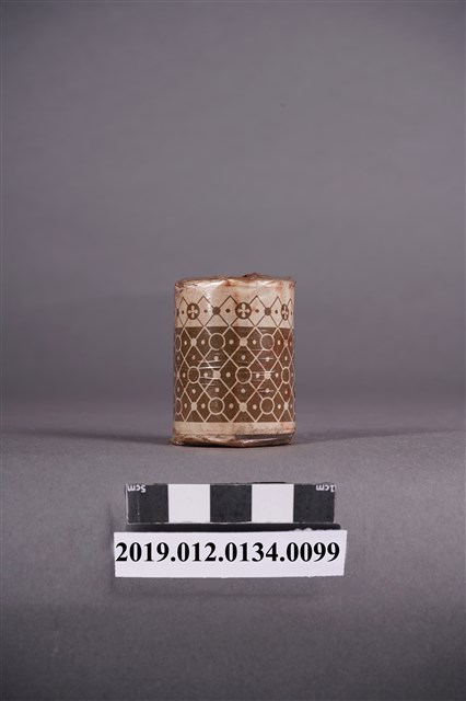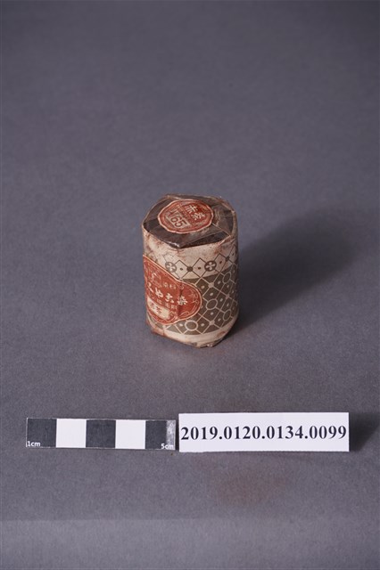 本文物為日治時期的染料,為裝有褐色的染料罐。染料罐外圍以印有黑色花紋的紙張包住,罐子正面貼有紅色紙張,並印有「酸性みや古染」、「ナイロン、絹、毛用」、「赤茶」及「家庭染料」等字的紙,並印有一燈塔樣。瓶蓋處的紙張印有「酸性……」及「NO.65」等字。