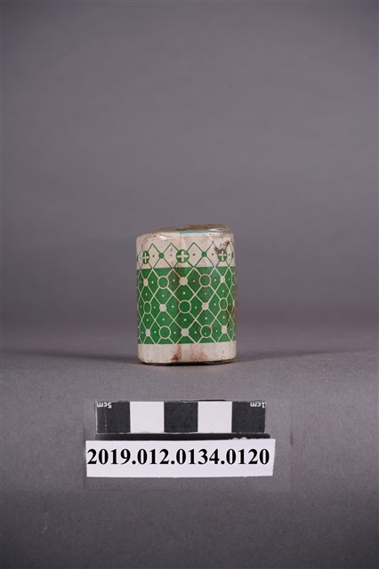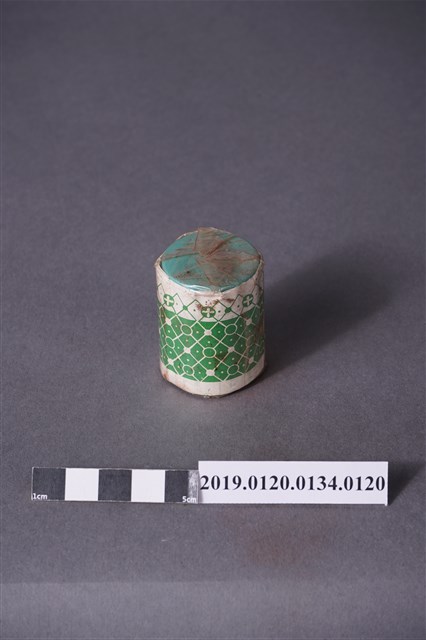 本文物為染料罐(水色),外觀花紋為綠色,可用於木棉、麻、絹、人工絹等,顏色下方寫有號碼4009。染料顏色為水色,為藍綠色,偏青色。罐外寫有家庭用染料,染料性質為直接染料,直接染料所指的是能直接溶於水,無需使用其他添加物。