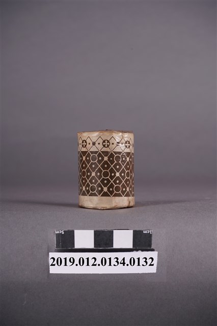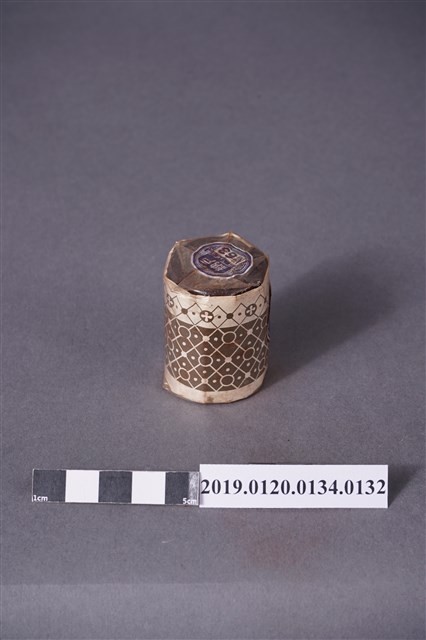 本文物為染料罐(納戶色),外觀花紋為黑色,可用於尼龍、絹、毛等,罐頂有編號NO.63。染料顏色為納戶色,納戶色是帶有點綠色的深藍色。罐外寫有家庭用染料,染料性質為酸性染料,酸性染料是含有酸性基團的水溶性染料,色澤鮮艷,對纖維素無著色效果。