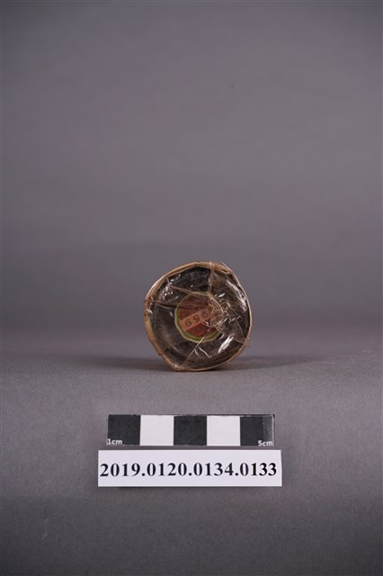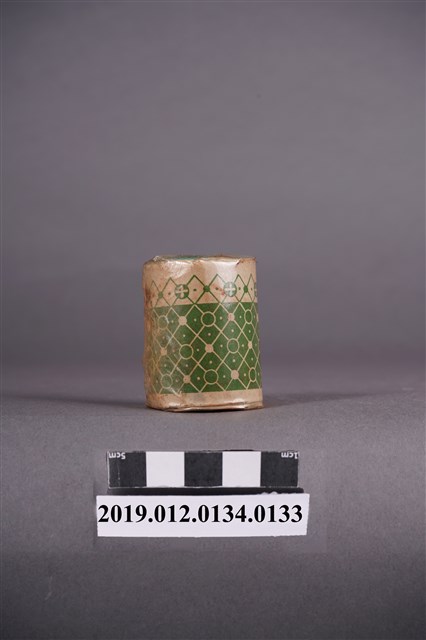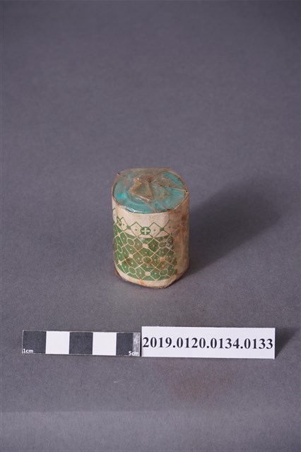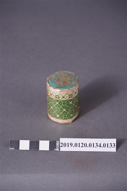 本文物為日治時期的染料,為罐裝物品。染料罐外圍以印有綠色紋路的紙張包住,再以塑膠材質包裝。包裝紙泛黃嚴重,且塑膠包裝上有多處黑點。
