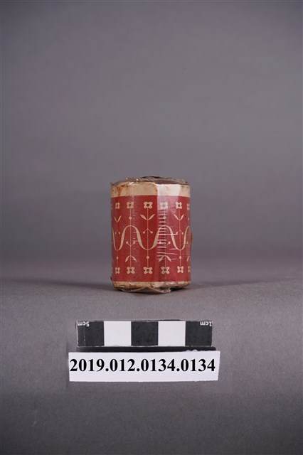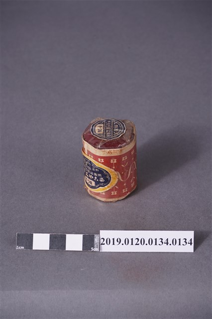 本文物為染料罐(紺色),外觀花紋為紅色,可用於毛線、毛織等。染料顏色為紺色,紺色為帶有藍色的深藍色,接近海軍藍、普魯士藍,サージ為羊毛、木棉、尼龍所製成的洋服,最典型的服裝為學生服。罐外寫有家庭用染料及特撰染料。