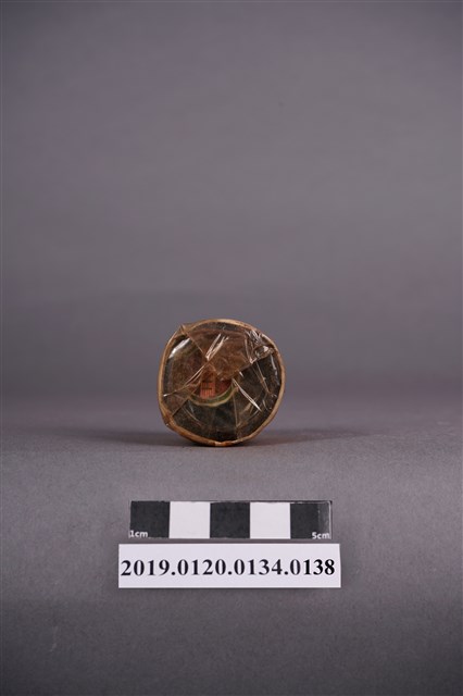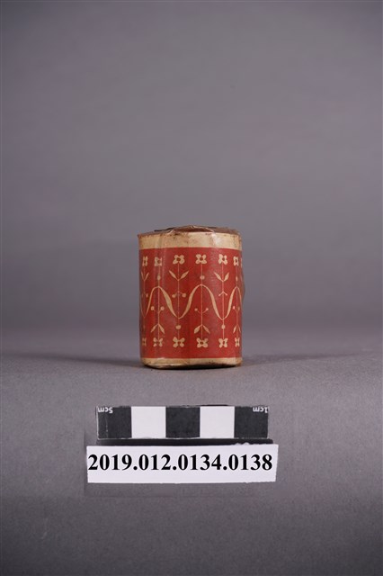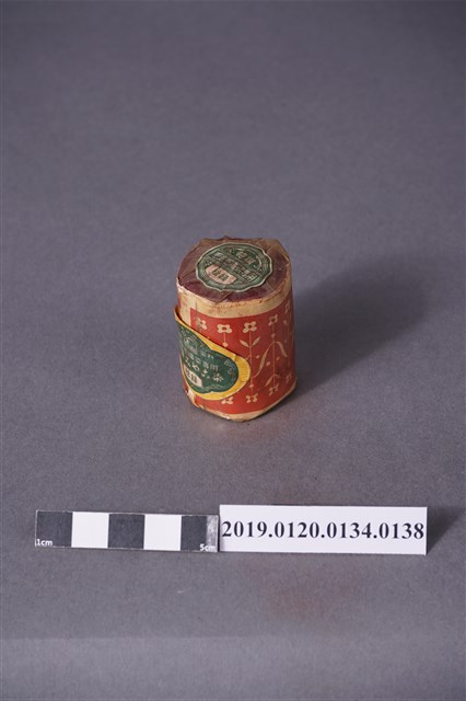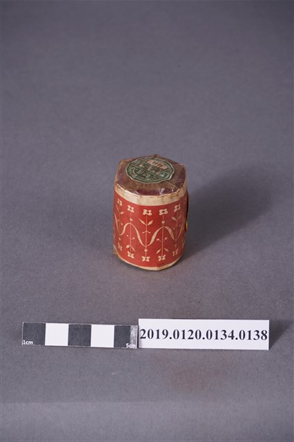 本文物為染料罐(松綠色),外觀花紋為紅色,可用於毛線、毛織等。染料顏色為松綠色。罐外寫有家庭用染料及特撰染料。