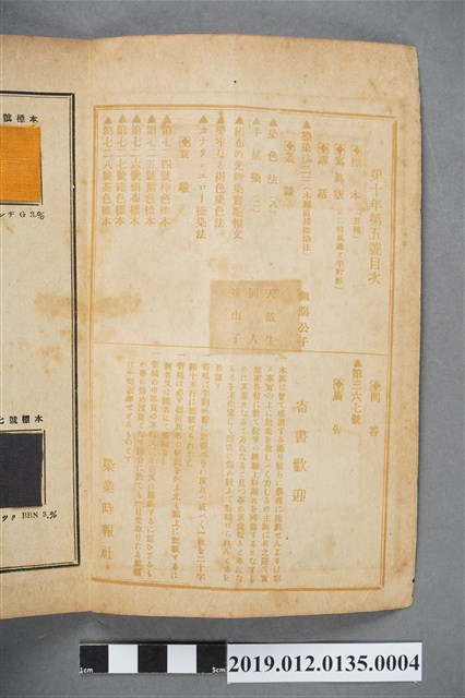 此為1918年7月14日,由京都染業時報社發行的《染業之友》雜誌第10年第5號,內容有「樣本」專欄、「報告」專欄:「印染法23(木棉直接印染法)」、「叢談」專欄:「染色法」、「手拭染」、「絹布的光線染實驗報文」等、「實驗」樣本專欄、廣告頁。
