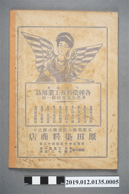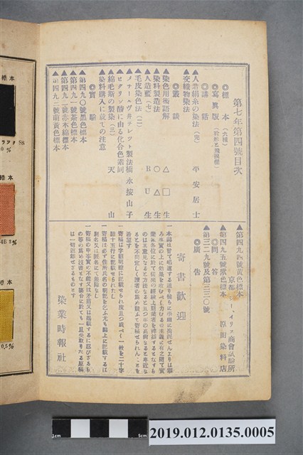 此為1915年4月30日,由京都染業時報社發行的《染業之友》雜誌第7年第4號,內容有「樣本」專欄、「報告」專欄:「人造絹系的染法」、「交織物染法」、「叢談」專欄:「染色用語解」、「染料製造法」、「人造染」、「毛皮染色法」、「棉毛絲的染製」等、「實驗」樣本專欄、廣告頁。
