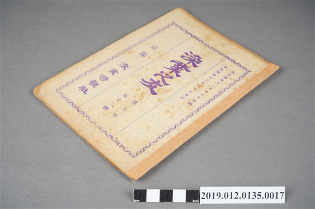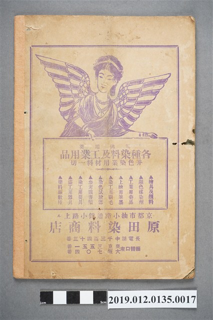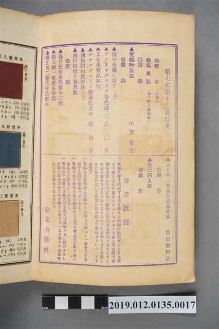 此為1915年12月20日,由京都染業時報社發行的《染業之友》雜誌第7年第12號,內容有「樣本」專欄、「報告」專欄:「交織物染法」、「叢談」專欄:「工業用藥品其他」、「通俗漂白洗滌法」、「流行展相片集」等、「實驗」樣本專欄、廣告頁。