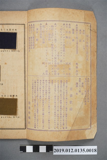 此為1918年9月13日,由京都染業時報社發行的《染業之友》雜誌第10年第6號,內容有「樣本」專欄、「報告」專欄:「印染法24(木綿直接印染法)」、「叢談」專欄:「染色法」、「手拭染」、「染色用語集」等、「實驗」樣本專欄、廣告頁。