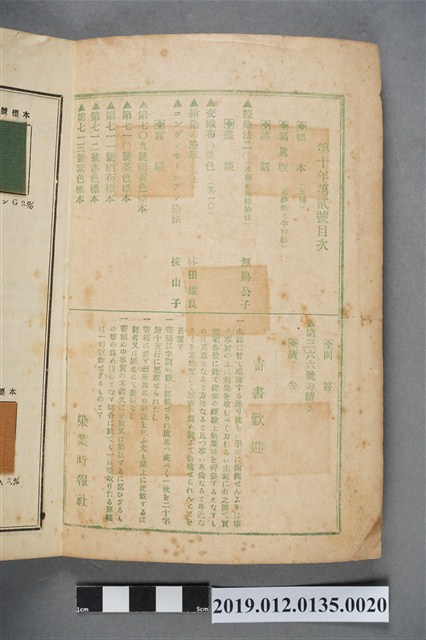 此為1918年3月10日,由京都染業時報社發行的《染業之友》雜誌第10年第2號,內容有「樣本」專欄、「報告」專欄:「印染法20(木綿直接印染法)」、「叢談」專欄:「交織布的染色」、「藍染的沿革」等、「實驗」樣本專欄、廣告頁。