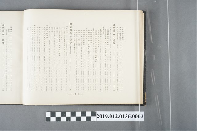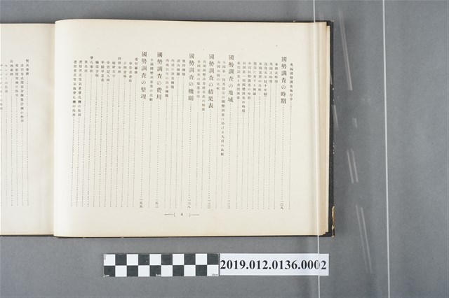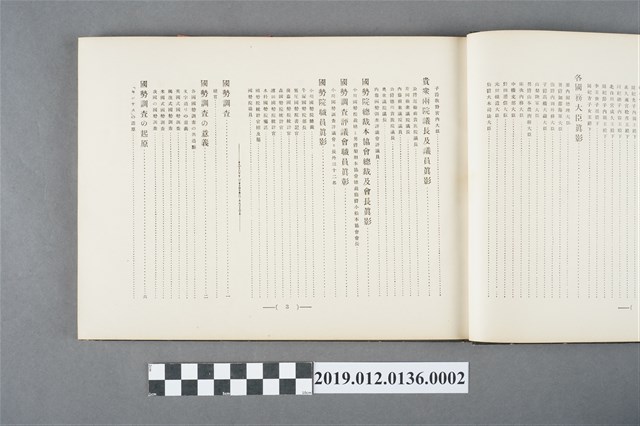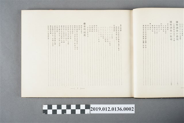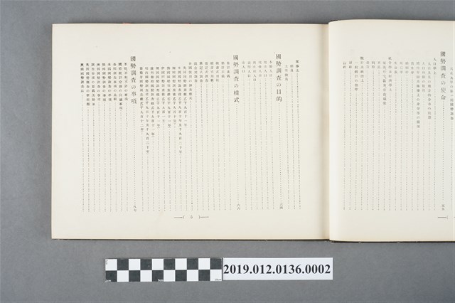 此為1922年10月25日,由日本國勢調查紀念出版協會發行的第五版《日本人口普查記念錄(第一卷)》,內容有「天皇命令書」、「通牒及訓示」、「天神神影」、「皇族影像」、「各國務大臣影像」、「眾兩院議長及議員影像」、「人口普查內容」包含意義、起源、沿革、使命、目的、樣式、事項、時期、地域、機關、費用等。