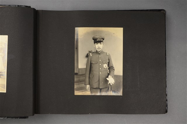 此為日治時期臺灣守備紀念冊內之相片,為一軍人身著制服,胸前有一枚八角徽章,手拿著白手套拄著一柄長槍。