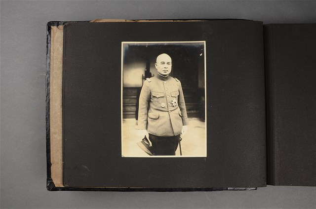 此為日治時期臺灣守備紀念冊內之相片,為一軍人身著制服,胸前有一枚八角徽章,手拿著軍帽。