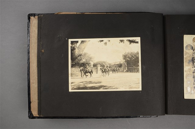 此為日治時期臺灣守備紀念冊內之相片,為一群軍人行軍的照片,前有三位騎馬者,後跟著一群步行的士兵。