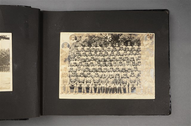 此為日治時期臺灣守備紀念冊內之相片,為一群軍官士兵之合照,皆身著統一制服,共有7排約90餘人。