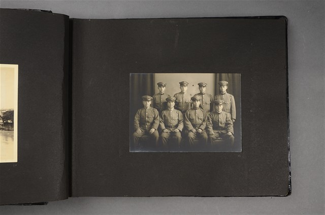 此為日治時期臺灣守備紀念冊內之相片,為8名軍官身著統一制服分為兩排,前排坐著後排站立。