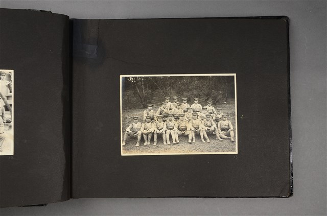 此為日治時期臺灣守備紀念冊內之相片,為19名軍人身著統一制服分為三排,皆坐於草地上。