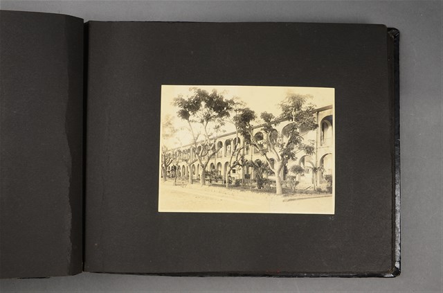 此為日治時期臺灣守備紀念冊內之相片,為一排日式建築物前有數棵高於建築物的樹木。