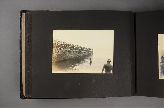 此為日治時期臺灣守備紀念冊內之相片,有一人站於水中,大批人群於岸上,貌似水中之人正在教授捕魚或游泳技巧。