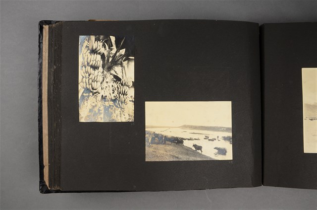 此為日治時期臺灣守備紀念冊內之相片,為一株芭蕉樹,掛有兩串結實累累的香蕉。