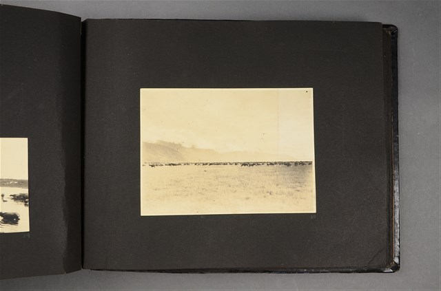 此為日治時期臺灣守備紀念冊內之相片,為一自然風景照,照片可見一片一望無際的草原,草原上有一群正在奔馳但無法辨認品種的動物。