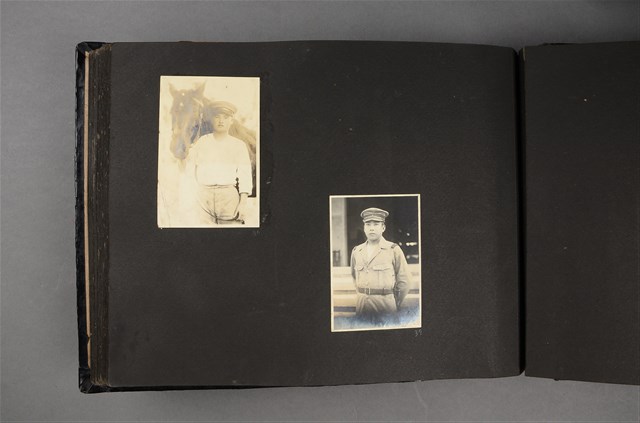 此為日治時期臺灣守備紀念冊內之相片,為一軍人身著制服立於一排階梯前,手背在後。