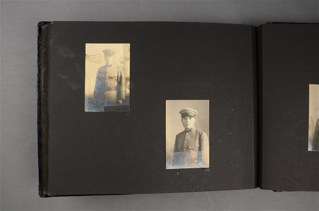 此為日治時期臺灣守備紀念冊內之相片,為一軍人身著制服,左下角有一鋼印,為「臺北」、「安武」字樣。