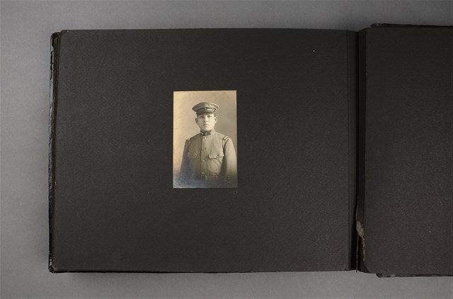 此為日治時期臺灣守備紀念冊內之相片,為一軍人身著制服,照片泛黃,左下角有一鋼印,為「臺北」、「安武」字樣。