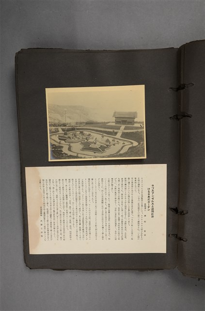 本文物收錄於昭和6年(1931年)由國風會發行之《世界國風大觀》當中。為洛杉磯一處廣場的近照,並附有一張說明紙。照片右方為寺廟般之建築物,左方則為一個大廣場,正中央放有兩處雕像。說明紙內容大致如下:「南加州的洛杉磯,1781年由西班牙人佔領,到了1846年(美西戰爭)之後,改由美國統治」由文學博士西村恒所寫,外務省所藏,照片禁止複寫轉載。