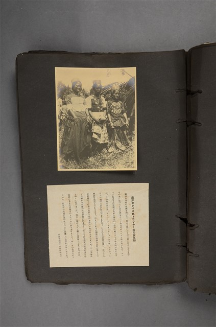 本文物收錄於昭和6年(1931年)由國風會發行之《世界國風大觀》當中。為三位南洋原住民婦女的近照,並附有一張說明紙。照片中的三人各著不同服飾,頭戴小帽子,望向遠方。說明紙內容大致如下「這座島嶼超過北海道的兩倍大,島上約有四種不同的原住民聚落」由文學博士西村恒所寫,外務省所藏,照片禁止複寫轉載。