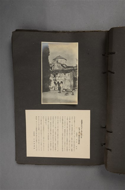 本文物收錄於昭和6年(1931年)由國風會發行之《世界國風大觀》當中。為希臘一處舊寺院的近照,並附有一張說明紙。照片的寺院約為兩層建築體,上方為圓頂,牆壁以石頭建造。說明紙內容大致如下:「這座寺院禁止偶像崇拜,因此不會以動物與人物的形體為裝飾」由文學博士西村恒所寫,外務省所藏,照片禁止複寫轉載。