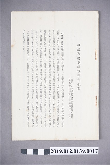 2019.012.0139.0017 臺灣製糖株式會社第51回例行股東會議總經理與常務董事報告概要