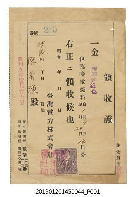 昭和9年1月26日臺灣電力株式會社開立之領收證第285號