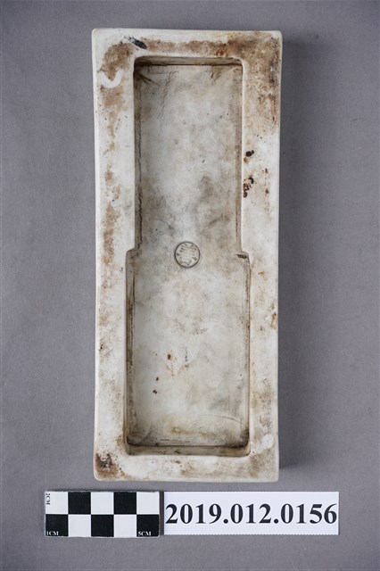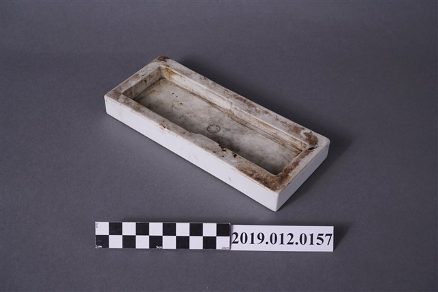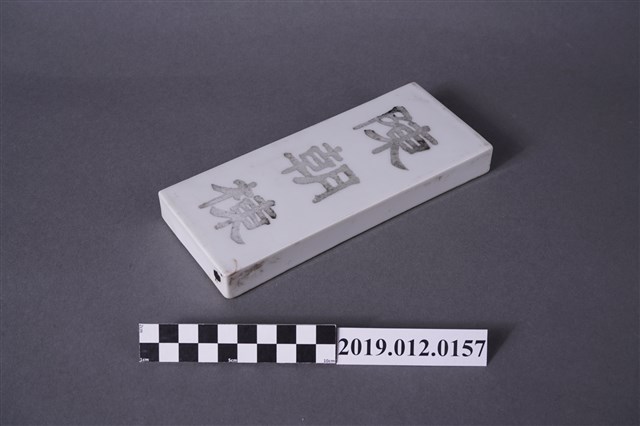 此為日治時期陳朝棟之名牌,共兩塊,無法確知年分,以白磁製成,背面挖空,形狀為長方形,其中一塊已稍微掉色。