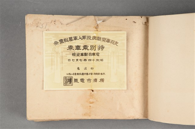 此文物為乘車卷,上面印著「支那事變戰病殆軍人軍屬慰靈祭 特別乘車卷 電車自動車全線 昭和十四年七月七日 御注意 本卷ノ御使用ハ當日參列ノ遺族御壹名二限ル 橫濱市電器局」,有一個印章。