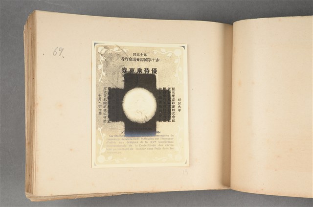 此文物為乘車卷,車票上印著「第十五回赤十字國際會議參列者 優待乘車卷 」,中間部分為一些株式會社的屬名,但被背景圖案所蓋過而無法辨認,最下面為外文的車票資訊。