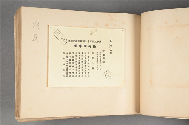 此文物為乘車卷,車票上印著「 第十五回赤十字國際會議出席者 優待乘車卷 有效期間 自昭和九年十一月二日至昭和九年十一月七日 區間全線」,車票上最後有許多株式會社的屬名,印有三個印章。