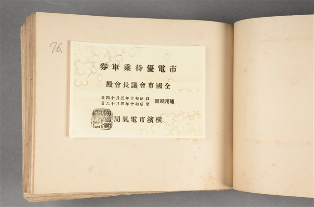 此文物為乘車卷,車票上印著「市電優待乘車卷 全國市會議長會殿 通用期間自昭和十年五月十四日至昭和十年五月十六日 橫濱市電氣局」,車票上有一個印章,背景圖案為櫻花。