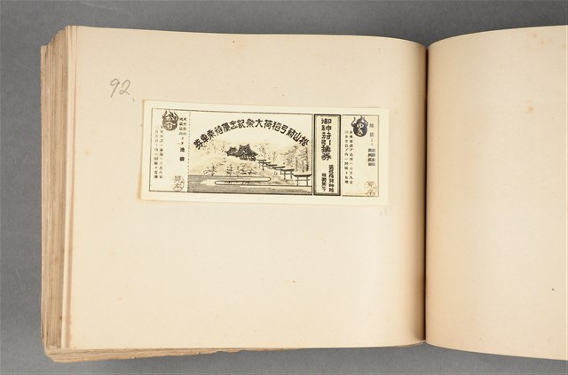 此文物為乘車卷,車票上中間標題印著「松山箭弓稻荷大祭紀念優待乘車卷」,背景為神社圖案,兩邊為車票資訊,