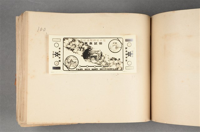 本文物為昭和11年(1936)京都市的電車乘車劵,為電車新線開通紀念的試乘劵,其中間方框內為京都的神社等景觀,下方並印有各電車車站站名。方框左右兩側,則印有「京都市」、「電車乘車劵」等字及圖案。