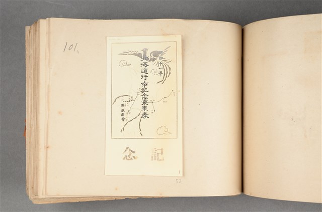 本文物為昭和11年(1936)由札幌鐵道局所發行的北海道行紀念乘車劵,其上方畫有一鳥獸的圖案,下方則為北海道地區各車站位置的地圖,而在整張票劵的最下方則寫有「記念」二字。