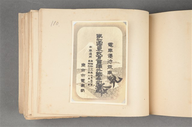 本文物為東京電氣局所發行的第七回世界教育會議外國參列者電車優待乘車劵,通用時間為昭和12年(1937)7月31日至8月8日,其背後也畫有富士山之圖案,也蓋一寫有「本見」二字的章。