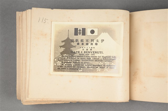 本文物為昭和13年(1938)4月,以日文漢字及義大利文書寫,為歡迎伊太利(義大利)軍艦至橫濱市參訪的特別乘車劵,其上方附有兩國國旗。
