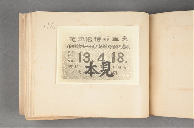 本文物為昭和13年(1938)由東京電氣局發行自治制發布50周年紀念祝賀會電車優待乘車劵,其通用期限為4月18日,並改有「本見」二字一章。
