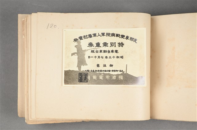 本文物為昭和13年(1938)7月11日,橫濱市電氣局所發行的支那事變戰病歿軍人軍屬慰靈祭電車特別乘車劵,本劵使用只限兩名遺族使用。在票劵上印有一士兵頭戴鋼盔,手持步槍之圖案,並蓋有橫濱市電氣局之章。