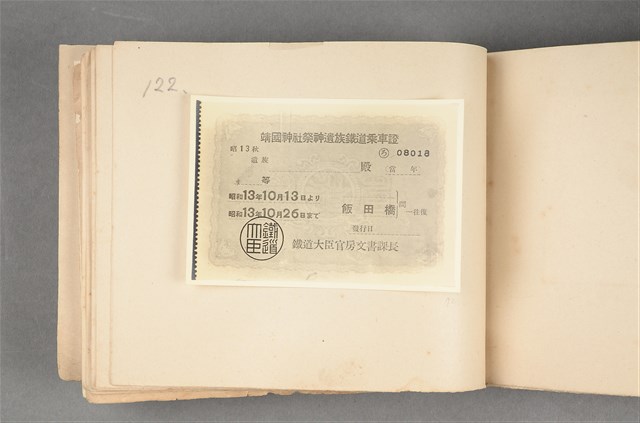 本文物為昭和13年(1938)由鐵道大臣官房文書課長發布的靖國神社祭神遺族鐵道乘車證,為到飯田橋站為止,其時間從10月13日到26日為止,編號為08018。