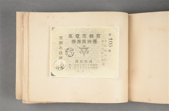 本文物為京都市役所所發行的京都市電車優待乘車劵,編號第105號,並蓋有一京都市役所之章,車劵四角有一藍色邊框。本文物內容的文字,已模糊不清,較難以辨識。
