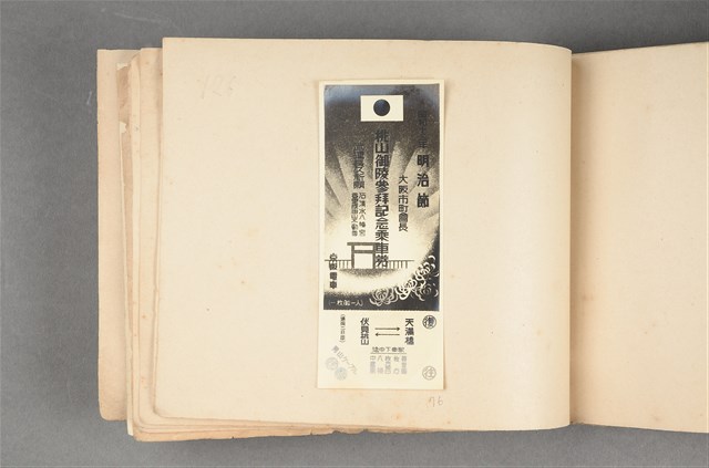本文物為昭和13年(1938)京阪電車所發行的明治節桃山御陵參拜紀念乘車劵,區間為天滿橋到伏見桃山來回車票,也寫有「武運長久祈運」、「石清水八幡宮」、「香里成田山不動尊」,車劵最上方有一日本國旗。